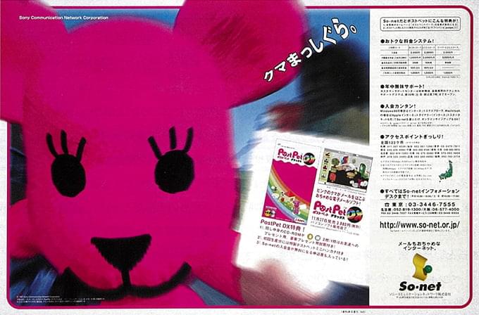 PostPet Macintosh版 β版を提供開始インターネットが一部のマニア向けだった中、ピンクのクマ モモ がメールを運ぶ新しい楽しみ方を提供。幅広い層に受け入れられ、爆発的なヒットに。モモ は、現在も So-net のキャラクターとして活躍中。