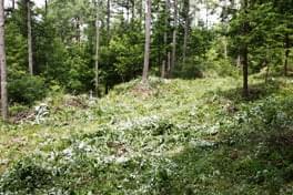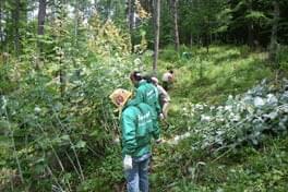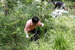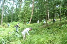 午前中は植林地の下草刈り作業です。4月に植えられた50cm程のヒノキの苗木(約300本)を見つけて、その周りの雑草を注意深く刈る作業です。生長の早い雑草に覆われてしまうと苗木の生長に影響がでてくるので、夏を中心に定期的に雑草を刈り取り、ヒノキの確かな生長を助けます。