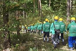 10月16日(土)、社員の家族も初めて参加し、小学生含む総勢31名が新幹線佐久平駅から貸切バスで 佐久市臼田総合公園管理センターに10時過ぎ到着。天気に恵まれた今回は、森林の除伐作業になります。 7月に続き、大沢財産区の方々と挨拶を交したあと、「So-netの森」看板設置エリアまで徒歩移動。 森に分け入り、お子さん達も一緒になって作業を開始しました。