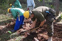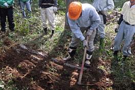 午後は椎茸のほだ場づくりの指導も受けました。鍬の扱いには慣れていませんでしたが、何とか20本の植菌した原木を埋めて ほだ場が完成。2年後にキノコが出てくるのを待ちます。