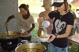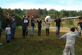 午前午後の作業の合間に取った昼食では、地元の皆さんの調理によるキノコすいとんの大鍋で元気回復。青空の下、解放感にあふれた食事で会話もはずみました。食材となったキノコもお土産にいただきました。