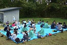 青空の下で昼食休憩
