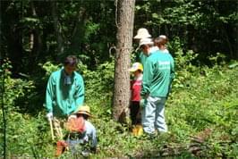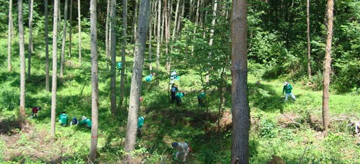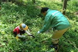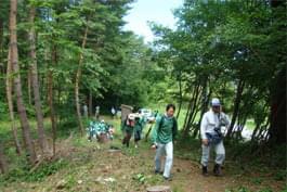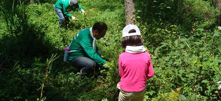 今回、社員の家族参加は2回目となり、4月に植えたヒノキの苗木に支障となる雑木の“下草刈り”を子どもも大人もみな汗をかいて作業してきました。その後「大沢森の分教場」での昼食、同じ佐久平にある「平尾の森」での森林セラピー、昆虫体験といったレクリエーションで楽しいひと時を過ごしました。