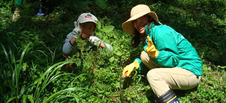 成長すれば人間の何倍にも大きくなるヒノキですが苗木は小さく、今回参加した小学生のお子さんたちよりも背丈は低いものです。そんなヒノキの成長を助ける“下草刈り”の作業も森づくりの一環なのだと、実際に作業してあらためて感じることができました。