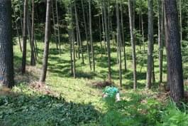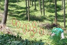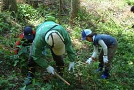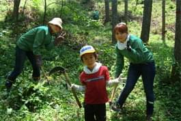今回の作業は下草刈り。4月に植林したヒノキの苗木の周りで日を遮っている雑草や絡みついているツタを黙々と取り除きます。鎌を使っての作業で要領は庭の草刈りと同様ですが、ヒノキの成長にとっては欠かせない大切な作業です。