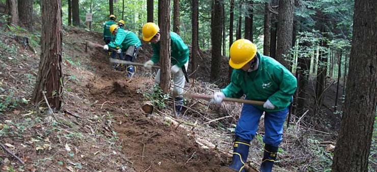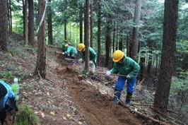 今回の作業は、So-netの小径整備です。6月にチェーンソーを用いて整備した山道を、鍬とノコギリを使って、人が安全に歩けるように均します。