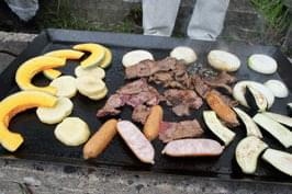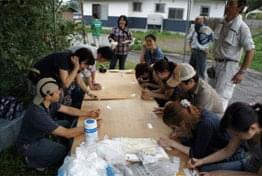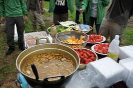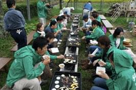 整備活動終了後は、みんなが待ち望んでいるお昼ごはん。今回はBBQです。地元でとれた野菜や果物を中心として、現地スタッフの方と一緒に、食事を楽しみました。すぐ近くの山で朝採れたキノコのお味噌汁は秋ならではの味で、疲れが一気に吹き飛びました。