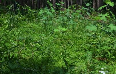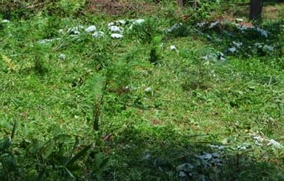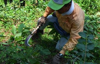 作業はいたってシンプルです。ヒノキを中心に周りの邪魔な草木を鎌で刈り取ります。中にはつたがからまって寄生するものもいるので、丁寧に取り除きます。