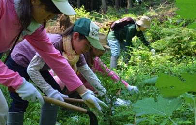 東京駅に集合したころは30度を超える暑さ、作業で身がもつかみな心配でしたが、10時ごろベースキャンプ「大沢の森分教場」に着いた際は思いのほか涼しく、着替えて長靴をはいたころには整備作業へのムードが一気に高まりました。