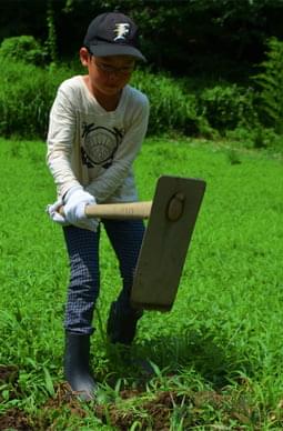 「下草刈り」は地面に生えたじゃまな雑草を刈る作業で、道具は鎌を用います。