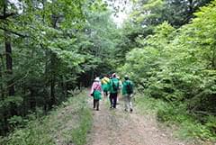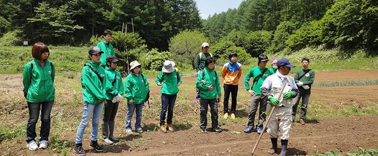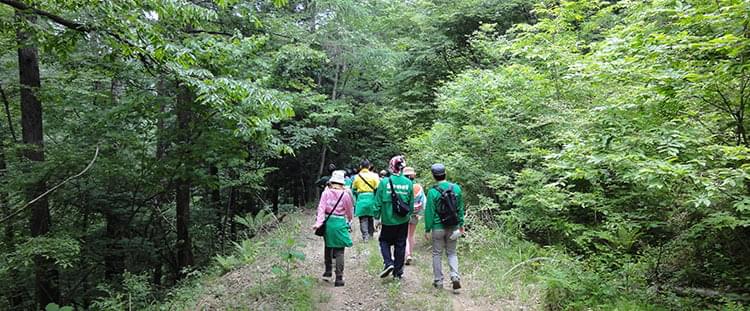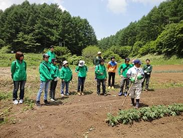 この日の参加メンバーは18名。今回は、午前中に4月に植えたじゃがいも畑の草取りを済ませた後、佐久の森林をトレッキングする工程です。