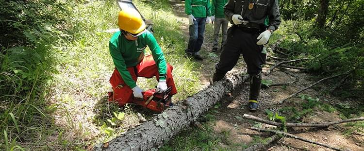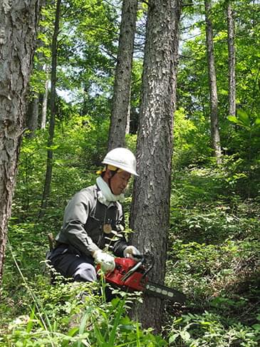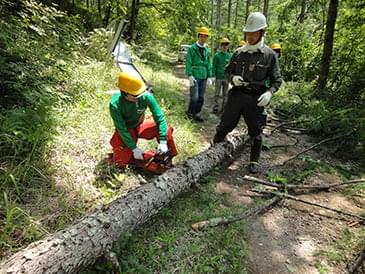この後、工藤さんが、たてこんだカラマツを1本チェーンソーで切り倒すデモンストレーションを実演する場面も。