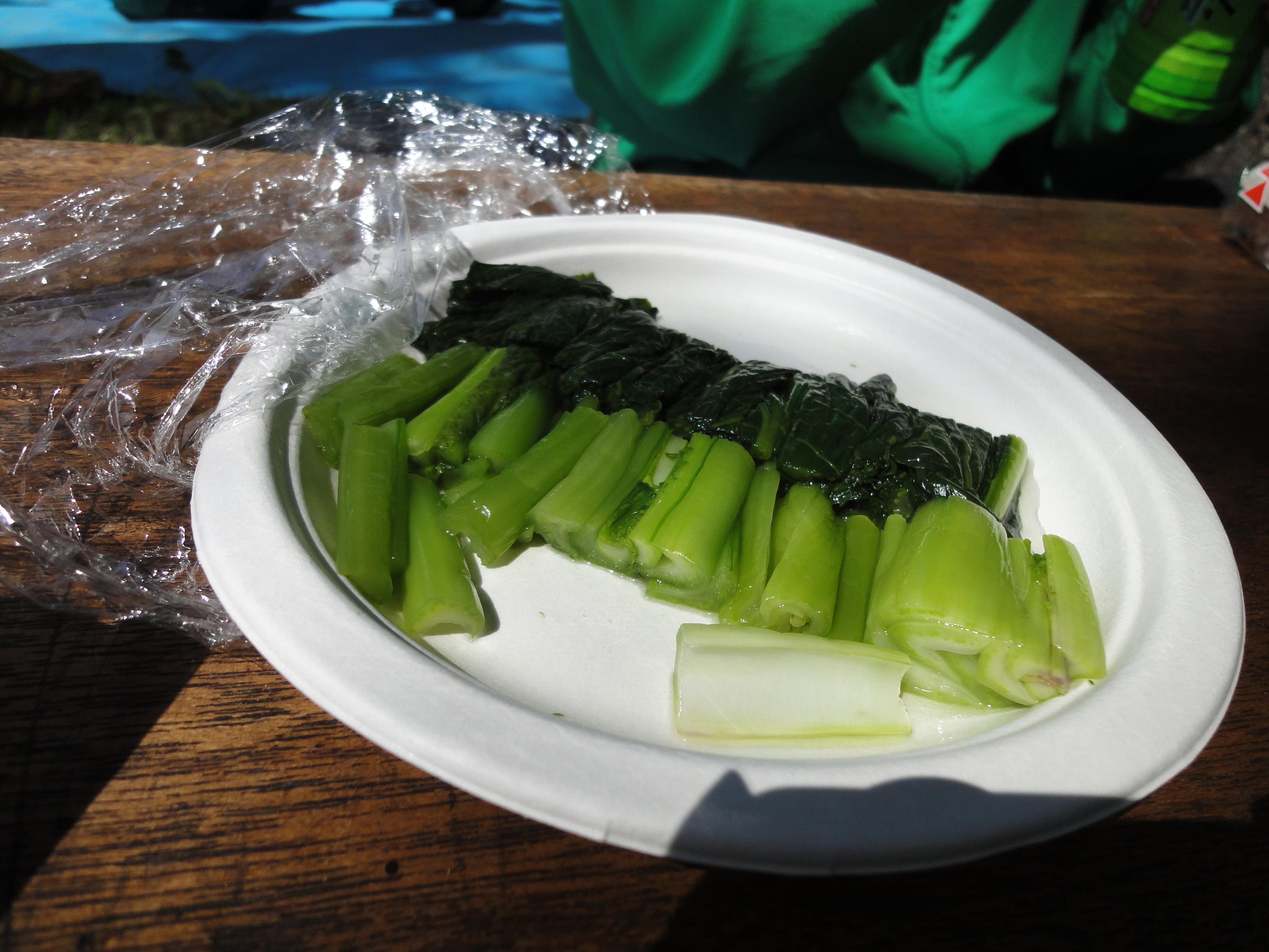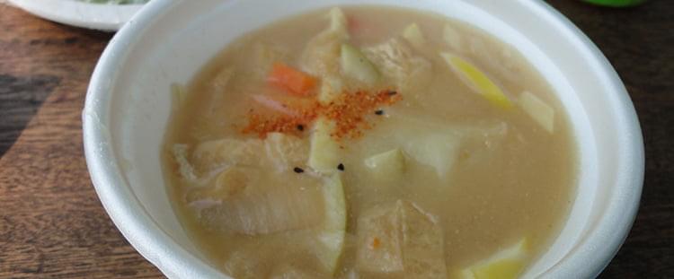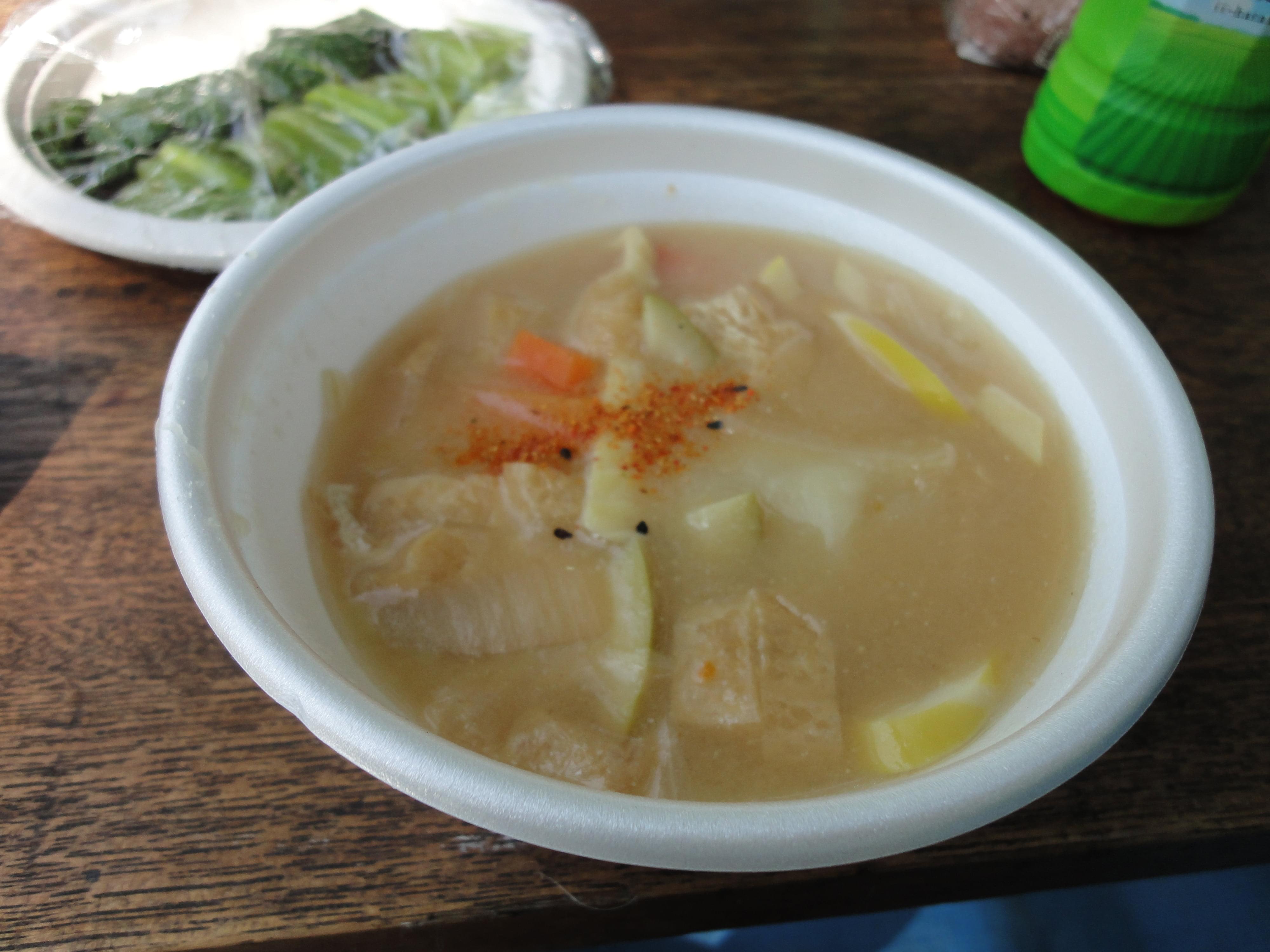 トレッキングで森や木々の知識を深め、心身ともにリフレッシュした後は待ちに待ったお昼ご飯です。具だくさんのすいとん汁におにぎり、野沢菜を青空の下で頂く贅沢を堪能しました。