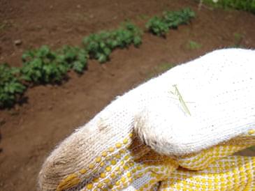ここでは、じゃがいもの育成の邪魔となる雑草取りをし、クワで根元に土を盛り寄せる作業に集中。爽やかだと思った気候も、何も遮るものの無いお天道様の下で、あっという間に汗が出てきます。作業中、見知らぬ虫と対面しては「キャー」という声も聞こえてきたり・・・。中には姿はテントウムシにそっくりながら実は害虫という虫も。