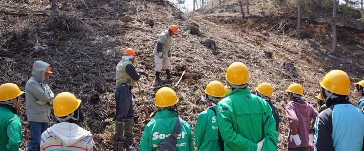 今年の植林はカラマツ600本!現地の方々から作業手順の説明を受けて、ソニー(株)環境推進センターの方々、新入社員メンバー、社員の家族と子どもたちも一緒になって植林を行いました。