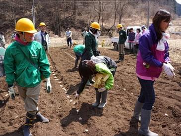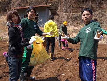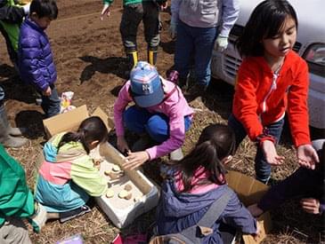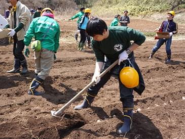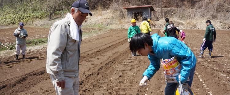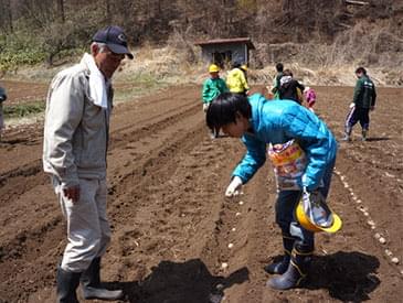 カラマツの植林を終えると、場所を変えて畑でじゃがいもの種芋の植えつけを行いました。ここでも現地の方から作業説明を受けると、新入社員メンバーや子どもたちがいっせいに作業を始め、予定よりも前倒しで作業が完了しました。