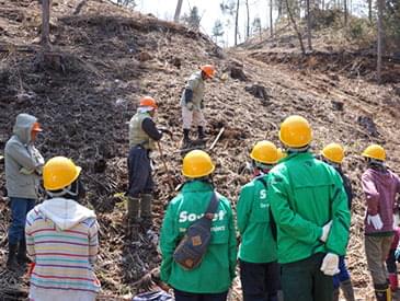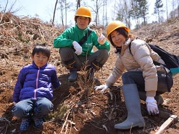 今回は、新入社員を含む社員、家族、子供たちが一緒に「カラマツの苗 600本」を植えました。また、初めてソニー(株)環境推進センターの方々にも参加いただきました。