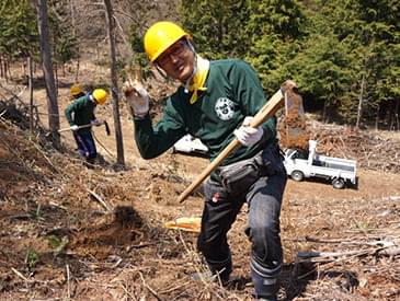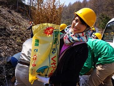 - 就職活動の最中にその存在を知ったSo-netの森。実際に足を運んでみるとやはりとても心地よく、見渡す限りの大自然に気分が高揚しました。作業エリアは 転げ落ちそうな急斜面でしたが、長靴を履いて軍手をはめ、同期や先輩方とともに意気揚々と挑戦した作業が非常に新鮮でした。大声を出しても反響しない、遠くを見ても山が続くばかり。日頃の生活では味わえない開放感と作業終了後の心地よい疲労感は、「参加して良かった」と心底思うことができるものでした。