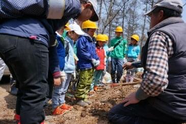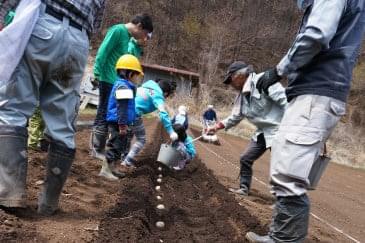 植林作業の後は、農業体験として、畑でじゃがいもの植付をしました。半分に切った種芋に防腐粉をまぶしたものを、均等に並べていき、間に肥料をまぶしたら土をかけます。夏には、繁殖したじゃがいもが収穫可能になります。