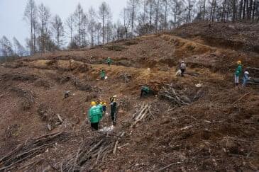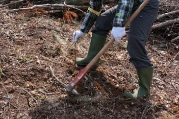 今回の活動のメインは、カラマツの植林です。鍬を使って30cmほどの穴を掘り、そこに苗木を植えて周囲をしっかり踏み固めます。子どもも多く参加しましたが、財産区議員の皆さんの教えをしっかり聞きながら1本1本丁寧に作業を進め、約2時間で600本の苗木を植えることができました。