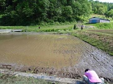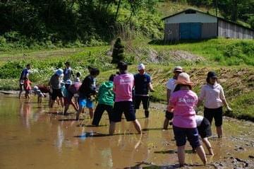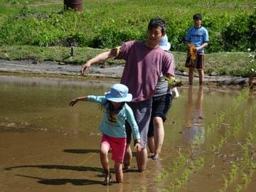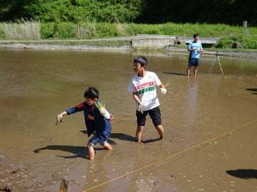 大人はもちろんのこと、子どもたちもここまで泥に浸かる体験は珍しいようで、転ばないようにやや緊張しながらも、終始笑顔で作業を進めていました。また、中腰での作業は、なかなかの重労働です。まっすぐに植えたつもりが、仕上がりは…。今後の成長が楽しみです。