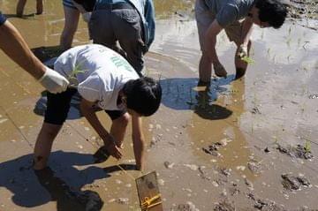 食事のあとは、田植え体験を実施しました。普段何気なく食べている米の栽培体験を通じて、「食」や「農業」について考えたり、水田に生息する「生きもの」や「植物」に触れることで生物多様性への関心を持ってもらったりすることが目的です。