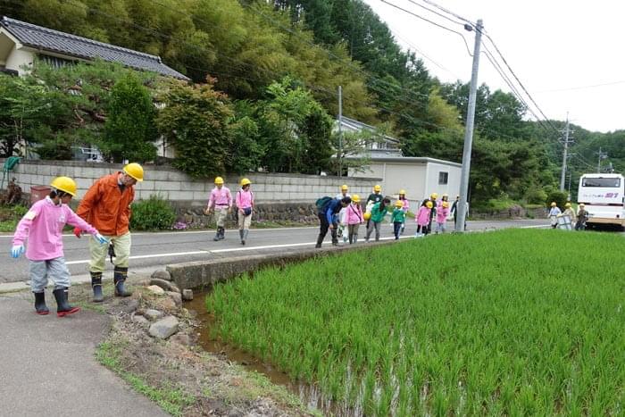 ちょうど田植えが終わり、うぐいすやカエルが鳴いている道すがら、桑の実を見つけたり、牛肉の朴葉みそ焼きに使う朴(ホウ)の木やフキの葉を見つけたりと、自然観察をしながら現場に向かいました。