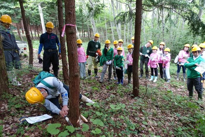 現場につくと、佐久市大沢財産区の方から、今回の間伐に関する説明や、道具の使い方などについて指導を受けました。