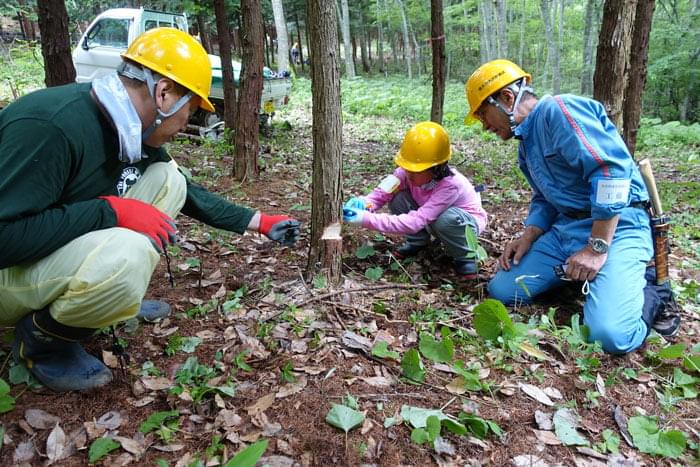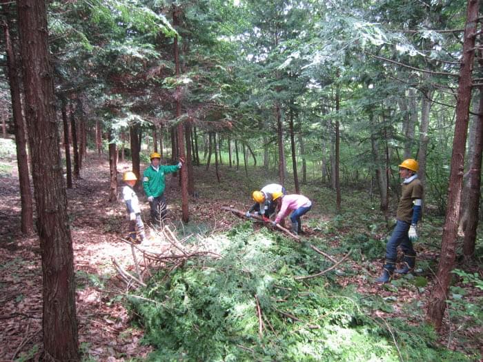 今回の森林整備活動では、佐久市大沢財産区の方々にご指導いただきながら、林齢16年生のヒノキの保育間伐を行いました。