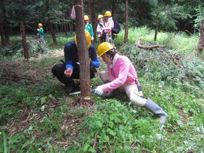 最初は慣れないノコギリで水分を含む生木を切っていくことに悪戦苦闘しましたが、指導を受けながら大人も子どもたちも徐々にコツをつかんでいき、無心に一本一本の木を間伐しました。作業を進めるにつれて、それまで暗かった森に光が差し込み、明るい森へと変貌していきました。