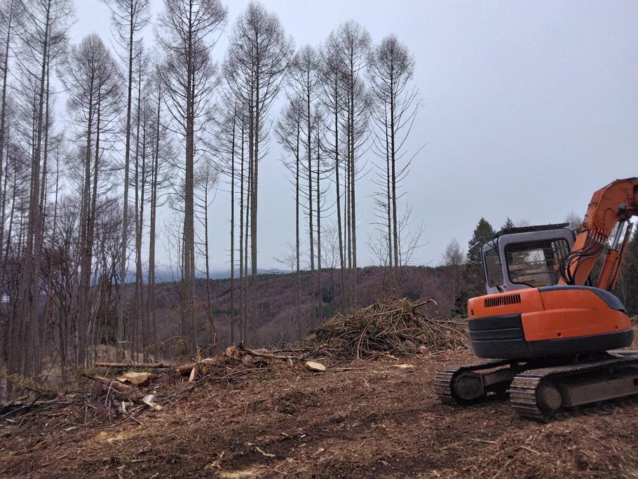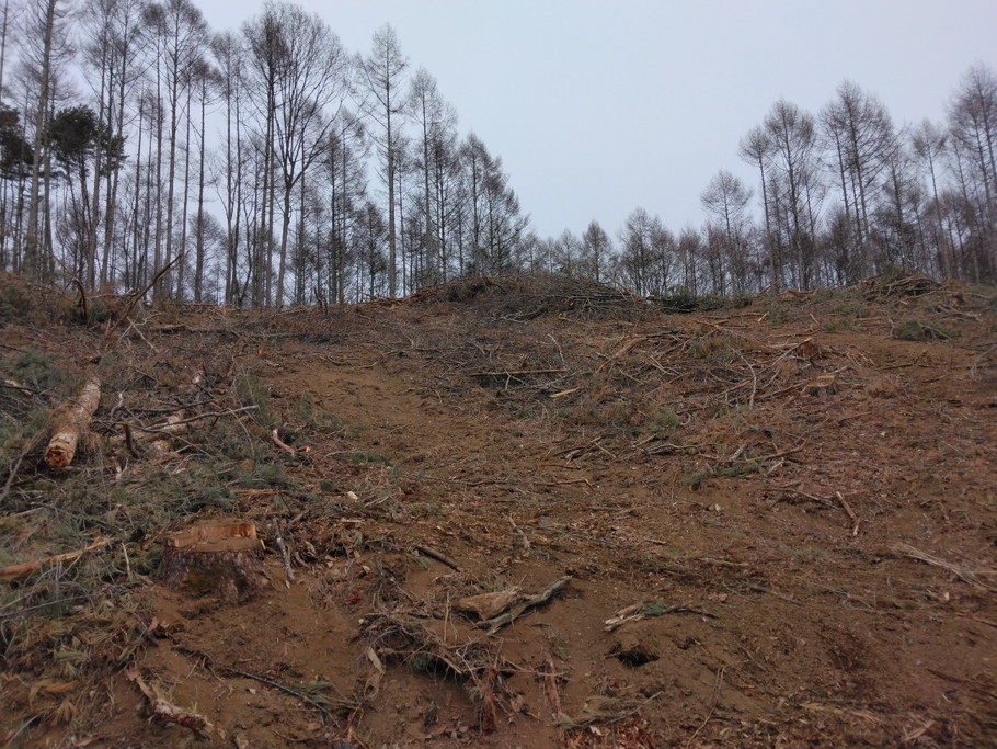 この植栽地は、以前樹齢30年から50年のカラマツが植わっていましたが、昨年すべてを切り倒し、その跡地に再びカラマツを植栽すべく重機を使って「地拵え(じごしらえ)」を行ってあります。