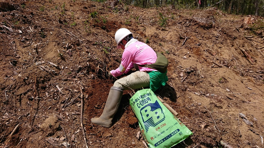 (かなり傾斜にきつい斜面に苗木を植えています)