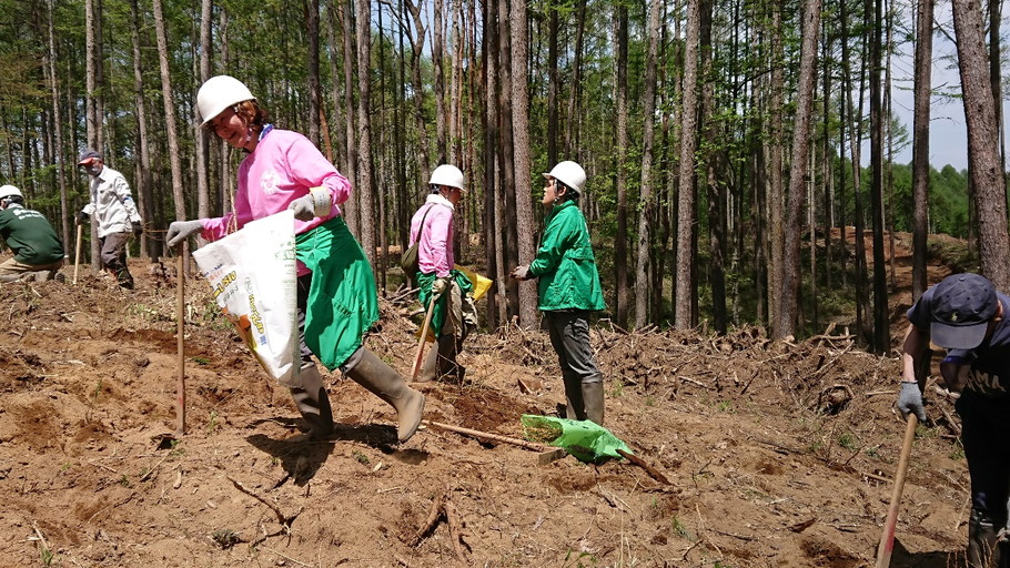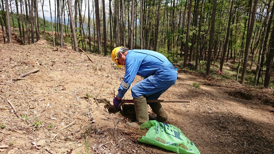 大沢財産区副議長の高畑さんから、カラマツの植栽について説明があり、唐鍬と呼ばれる独特の鍬を使い、30~50センチほどの深さに掘り、カラマツの苗木を入れたら、土をかぶせ、足で苗木の周りを十分に踏み固め、植え付けをしっかりするよう説明を受けました。この先30年以上同じ場所で生育していくのですから、植え付けが浅かったり、よく踏み固められていなかったりするとしっかりと育たないので、注意深く行っていく必要があります。