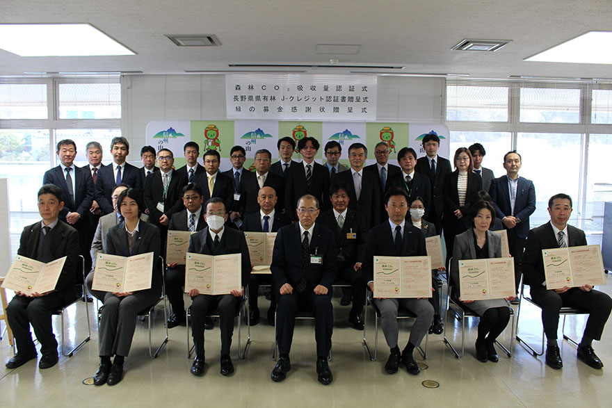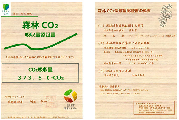 当社は2020年から「長野県の森林Co2吸収評価認証」を申請しており、この度、2019年から2023年度までの森林整備活動によって合計373.5 t-CO2/年 のCo2が吸収されたと認証されました。