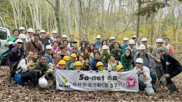 10月26日、長野県佐久市の『So-netの森』にて37回目となる森林整備活動を行いました。今回は、社員とその家族、ソニーグループの社員も含め約60名の参加者でコナラの間伐・除伐を行いました。