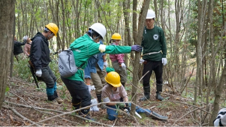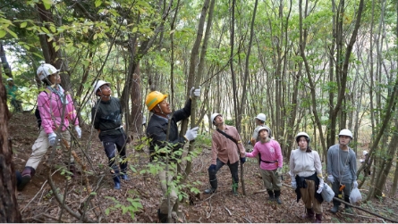 10人程の班に分かれて作業開始。どの木を切るべきか、残すべきか、各班に付いた大沢財産区の皆さんの指示をもとに、伐採します。森林には急斜面もあり、互いに声を掛け合いながら協力して作業を行いました。