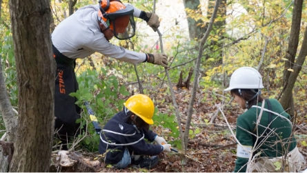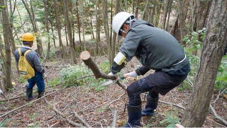 今回の森林整備活動は、一部の木を伐採し森林全体の密度を調整する間伐と、生育不良や形の悪い木を伐採する除伐です。