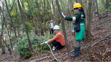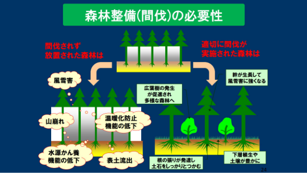 今回行った間伐・除伐作業で、①光合成が活発になって樹木の成長が促進される、②下層植生が繁茂して生物の多様性が育まれる、などの効果が生まれ、より豊かな森を維持することができます。どちらも木々の密集を防ぎ、光合成を促進して、将来性のある木を生育するために重要な森林整備です。人の手で整備を行うことで森林は循環していくというわけです。