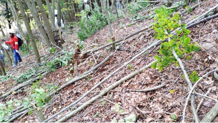 参加者同士で協力しながら下枝や生育不良な細い木を切ります。伐採後の木を70~80cmにさらに短く切り揃える「玉切り」にしていきます。急斜面での足を踏ん張りながらの間伐作業に四苦八苦する参加者も。