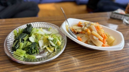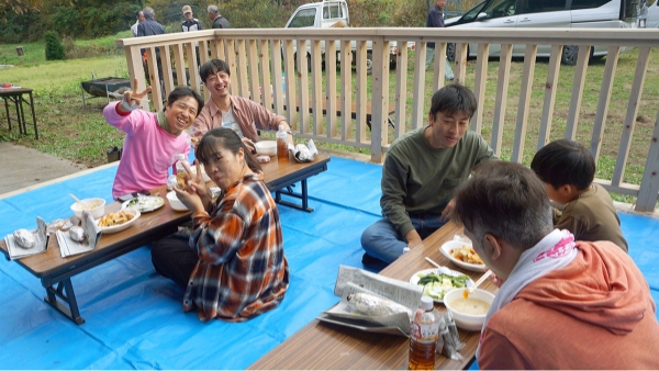 森林整備活動でしっかり体を動かし、心地よい疲れとともに分教場に戻った参加者たち。 大沢財産地区の「お母さん」たちによる手作りの豚汁や郷土料理に笑顔です。