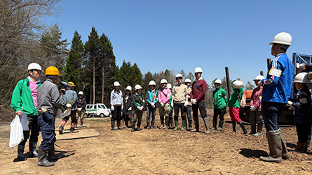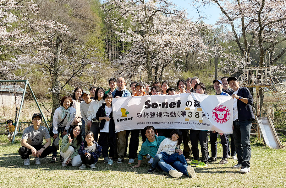 4月26日、長野県佐久市にある『So-netの森』で第38回森林整備活動が行われ、社員とその家族合わせて29人が参加しました。当日は初夏の訪れを感じさせる快晴で、新緑に囲まれての活動となりました。
