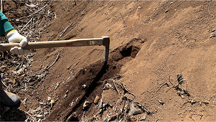 唐鍬(とうぐわ)と呼ばれる細長い鍬で山の斜面に穴を掘ります。そしてカラマツの苗木を植え、土をかぶせてしっかり踏み固めます。