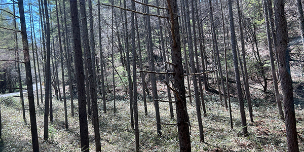 作業現場の奥には大きなカラマツの木が。ここまでなるには30年はかかるらしいと聞き、30年後がとても楽しみになりました。ぜひ子ども達には見にきてもらいたいです。