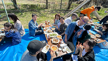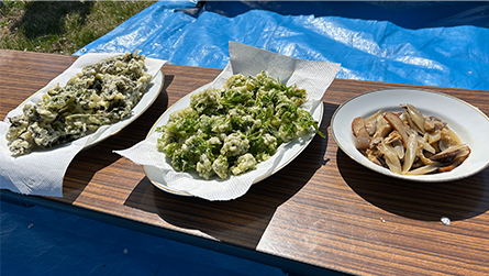 作業後は、大沢財産地区の方々が用意してくれていた料理を楽しむ時間。手作り豚汁や煮込み、ウドの酢味噌和え、山菜のコシアブラ、タラの芽の揚げたててんぷらをいただきました。