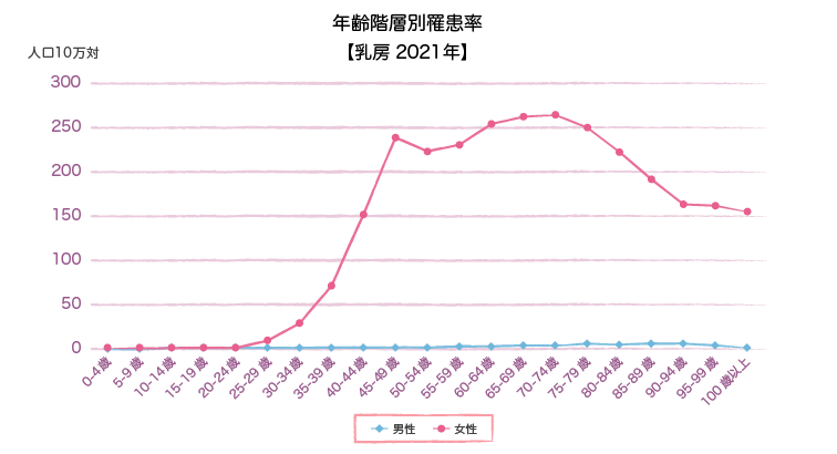 最新の統計では、生涯で乳がんを患う日本人女性は9人に1人と推定されています。女性の30~64歳では死亡原因のトップであり、罹患者数も年々増え続けています。年齢に比例して増える他のがん(*1)と異なり、乳がんは30代から増加しはじめ、40歳代後半から50歳代前半にピークを迎えます。一方で60歳を過ぎてかかる人や20代で患う人もいますので、誰もがかかりうる病気として「自分ゴト」化し、日頃から関心を持つことが大切です。
