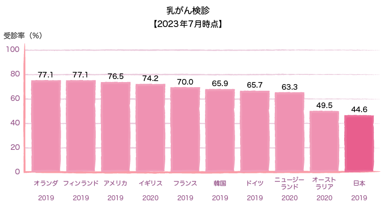 欧米諸国では、乳がん検診の受診率が70~80%と高く、検診受診率の向上に伴って、乳がんの早期発見が増え、死亡率が年々減っています。一方で、日本では国が定期的な検診受診を推奨しているものの、乳がん検診の受診率はわずか41%です。これは、OECD(経済協力開発機構)加盟国30か国の中で最低レベルに位置します。