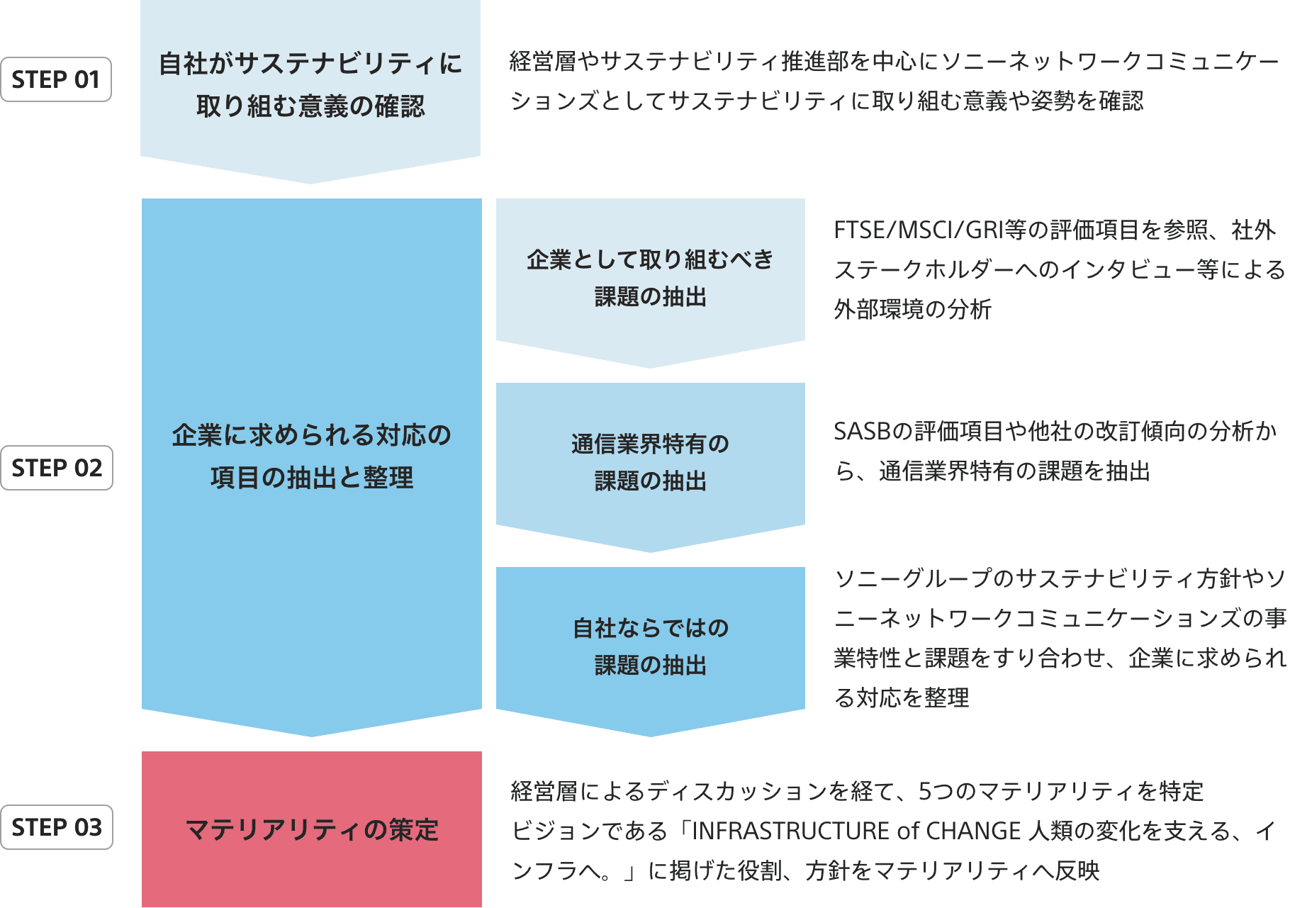 経営層によるディスカッションを経て、5つのマテリアリティを特定ビジョンである「INFRASTRUCTURE of CHANGE 人類の変化を支える、インフラへ。」に掲げた役割、方針をマテリアリティへ反映